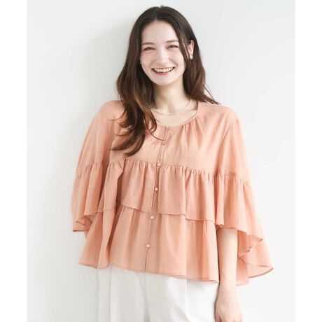 分量感たっぷりのシフォン素材の見た目にも可愛いブラウス。ポンチョのようなシルエットで、丈が短めなので重たくならずに着こなせます。