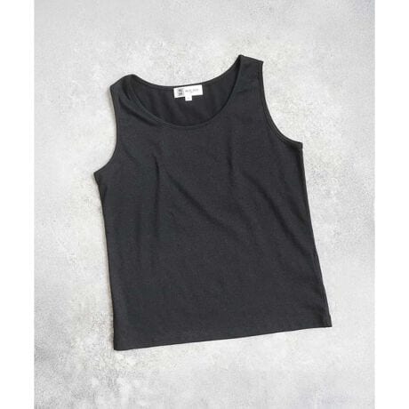 開きすぎないクルーネック、下着の紐が覗きにくい肩幅、ボトムにインしてもゴワつきにくい短丈が使い勝手の良いタンクトップ。ラメ感がトレンドライクな一枚です。