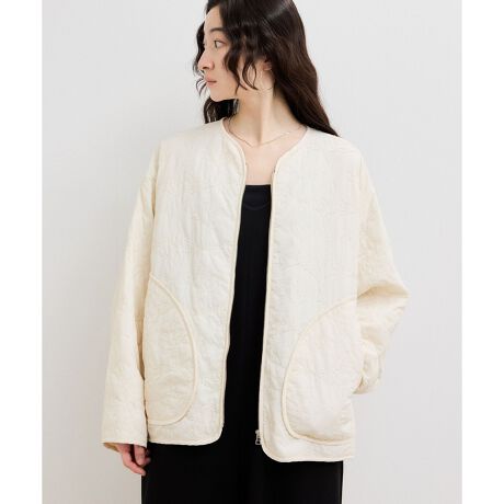薄手のワッシャーナイロンタフタ生地に、曲線と直線からなる幾何学模様を、膨らみのあるモール糸で軽い中綿素材とキルティング加工を施した1枚。