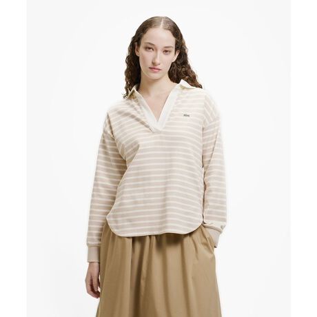 [型番:KF002J-99]ヘビーデューティーなアイテムにフェミニンを添えたボーダースキッパーラガーシャツ・ヘビーデューティーなコットンジャージ素材・首周りと袖口を単色で切り替えたラガーシャツデザインを、女性的なスキッパーネックで・トレンドに寄り添うリラックスフィットシルエット・丸みを帯びたラウンドヘムデザインRELAXED FIT