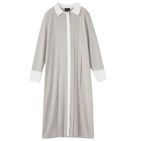 衿や袖口の配色ディテールがさりげないアクセントとなり、全体を引き締めます。また、プリーツ加工のように見える折り目は、特殊な編みと縫製技術で表現され、美しい立体感を長く保ちます。素材の美しさと技術が調和した、エレガントで実用性も兼ね備えた一着です。