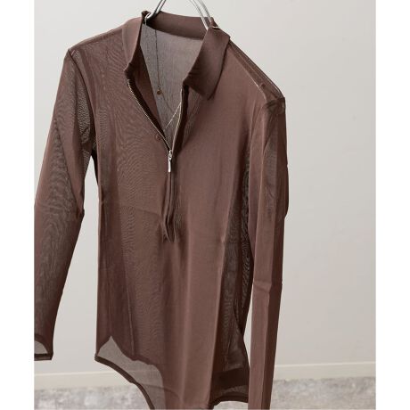 濱本さんの日々のスタイリングにもよく登場し、愛用しているボディスーツ。あったら嬉しいシアー素材×ZIPデザインを形にしました。スッキリと着られるのでおすすめ。シャツにレイヤードしたり、ブラトップと合わせたりしてシアー感を楽しむのもオススメです。