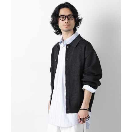 ポリエステル素材にギマ加工を施し、麻のようなシャリ感と光沢感を表現した、ありそうでなかったニット。若い世代に人気のポロカラーのカーディガンデザインを採用した春先におすすめに一枚です。