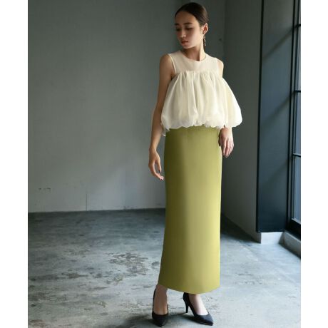 オーガンジーのボリュームトップスがセットとなったワンピースドレス。ワンピースはシンプルなIラインシルエットで、トップスがラグジュアリーな華やかさを足してくれます。