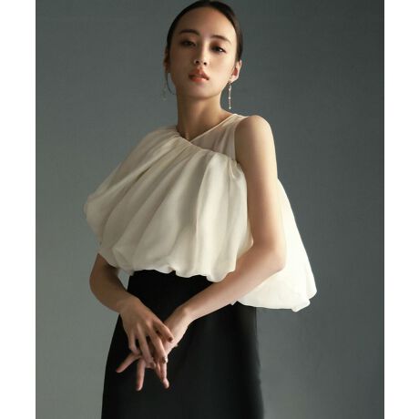 トップスはたっぷりとギャザーの入ったバルーンシルエットで、オフショルダー・ワンショルダー・ベアトップとして、いくつもの着方を楽しめるデザインです。