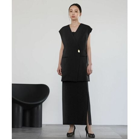 W仕立てのトップスはフロントは敢えてゴールドのニュアンスボタンの1つのみ。