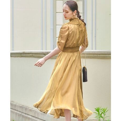 高めのネックとギャザー使いがポイントになったクラシカルな印象のワンピース。