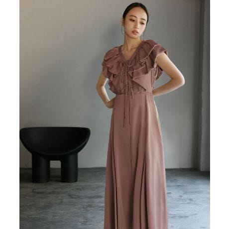 二重に重ねたラッフルが目を惹くフェミニンなパーティードレス。