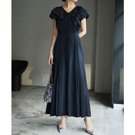 二重に重ねたラッフルが目を惹くフェミニンなパーティードレス。