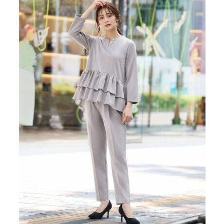 ふわりとしたティアードフリルが大人可愛いプルオーバーと、定番人気のテーパードパンツをセットにした2点セットアップスーツです。