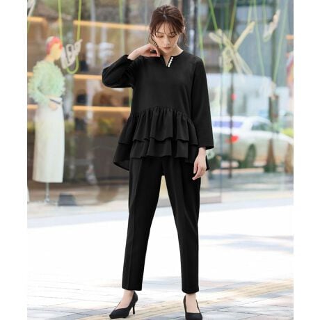 ふわりとしたティアードフリルが大人可愛いプルオーバーと、定番人気のテーパードパンツをセットにした2点セットアップスーツです。