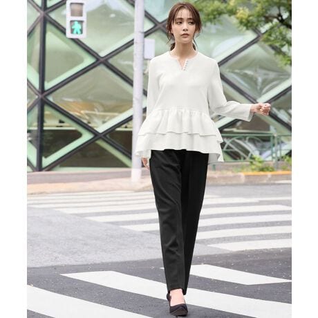 ふわりとしたティアードフリルが大人可愛いプルオーバーと、定番人気のテーパードパンツをセットにした2点セットアップスーツです。