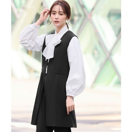 すっきりとしたVカラーが着こなしやすいロングベストに、ふんわりとしたボウタイブラウス、オンオフ使える美脚ストレートパンツまで付いたお得感のある3点セットアップ。トレンドライクなロングベストはブラウスと合わせやすいすっきりとしたVカラーに。