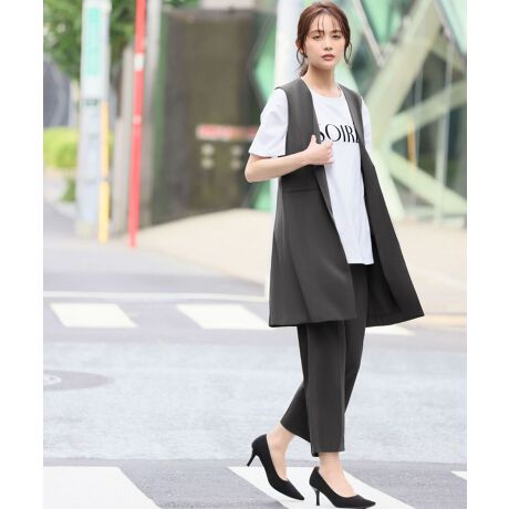 すっきりとしたVカラーが着こなしやすいロングベストに、ふんわりとしたボウタイブラウス、オンオフ使える美脚ストレートパンツまで付いたお得感のある3点セットアップ。トレンドライクなロングベストはブラウスと合わせやすいすっきりとしたVカラーに。