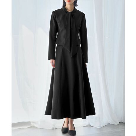 ディテールコンシャスなボウタイが印象的なジャケットとフレアスカートをセットにした2点セットアップスーツです。