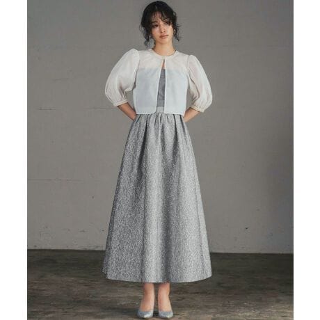今季トレンドのシアー素材のパフスリーブブラウス、インナーチューブトップ、ジャガード素材のボリュームスカートの素敵で大人可愛い、大変お得なオケージョン3点セット。