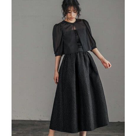 今季トレンドのシアー素材のパフスリーブブラウス、インナーチューブトップ、ジャガード素材のボリュームスカートの素敵で大人可愛い、大変お得なオケージョン3点セット。
