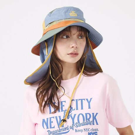 首裏までしっかりとカバーし、登山、ランニングなどあらゆるアクティブシーンで活躍するサンシェード付きハット。柔らかなメッシュ生地との組み合わせにより快適な被り心地を実現。4方向にストレッチを効かせて、動きの激しいシーンでもしっかりと頭にフィットします。シェードで首裏の日焼け対策が可能。UVカット機能も付いています。シェードは丸めてハットのツバ部分に収納可能。ハット本体にメッシュを採用し、通気性抜群。後面のアジャスターでフィット感の調節が可能です。