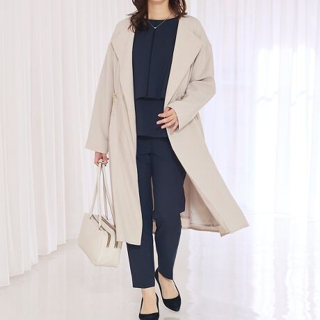 ドローコードでウエストマークを調節出来るスプリングコートの登場です。ボタンレスでインのコーデを隠さずにスタイリング出来る、春にピッタリの織。きれいめから大人カジュアルまで幅広く活躍します。あえて身幅をたっぷりさせ、ドローコードでウエストを絞る事で大人なドレープ感を楽しめるデザインに。動きによって揺れる雰囲気はカジュアルコーデもグッとハイクラスに仕上げてくれます。