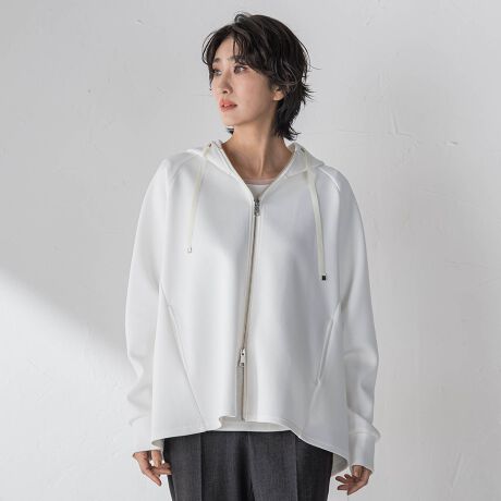 シルエットをテント型にフレア展開しており、裾の切り替えをなくしてキレイ目デザインにしています。