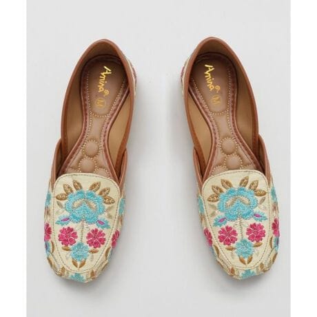 インドの伝統靴ジュッティに、華やかな花の刺しゅうを施したデザイン。合皮素材にカラフルな糸が映え、足元を彩る一足。クッション性があり、歩きやすさも魅力。