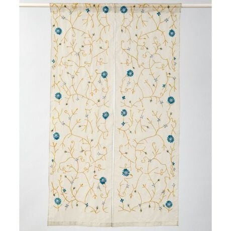 透け感ある素材に花柄をのせたインドノレン。光をやわらかく通し、空間に軽やかな印象をプラス。優しい彩りが暮らしにそっと寄り添います。