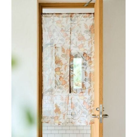 [型番:IRAP6104-2026]花や鳥、果物などをあしらった柄が美しいノレン。インド・ラジャスタン地方の伝統織物コタドリアを使用し、透け感のある軽やかな素材が風に揺れて心地よいリズムを生む。お部屋にやさしい彩りを添える一枚。