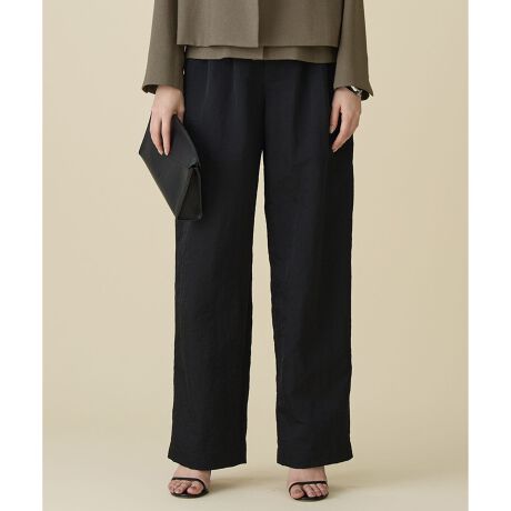 気負わず履けてきれいに見える大人のナイロンボトムス■デザインナチュラルなシワ感とほのかな光沢が大人っぽい印象の素材で仕立てた、タック入りのカジュアルボトムです。ほんのりカーブを描くシルエットが特徴で、定番のワイドストレートとは異なる、今年らしいバランスがポイントのアイテムです。ウエストにはゴムを入れ、快適な着心地も叶えています。ナイロン100%のきれいめ素材に、あえてカジュアルな表情を加えたことで、上品さとラフさをほどよく両立し、大人の余裕を感じるリッチカジュアルを楽しんで着こなしていただけます。■素材程よい光沢のあるナイロンツイルに特殊加工を施し、適度なハリ感とヴィンテージライクな風合いが魅力のユーティリティ素材です。撥水加工もプラスしており、機能性も兼ね備えています。
