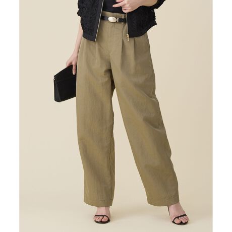 気負わず履けてきれいに見える大人のナイロンボトムス■デザインナチュラルなシワ感とほのかな光沢が大人っぽい印象の素材で仕立てた、タック入りのカジュアルボトムです。ほんのりカーブを描くシルエットが特徴で、定番のワイドストレートとは異なる、今年らしいバランスがポイントのアイテムです。ウエストにはゴムを入れ、快適な着心地も叶えています。ナイロン100%のきれいめ素材に、あえてカジュアルな表情を加えたことで、上品さとラフさをほどよく両立し、大人の余裕を感じるリッチカジュアルを楽しんで着こなしていただけます。■素材程よい光沢のあるナイロンツイルに特殊加工を施し、適度なハリ感とヴィンテージライクな風合いが魅力のユーティリティ素材です。撥水加工もプラスしており、機能性も兼ね備えています。