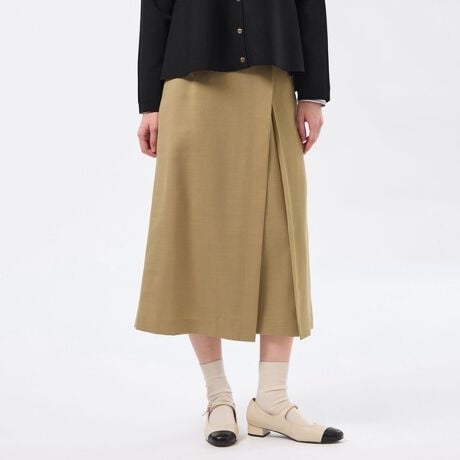 すっきりとしたタイトシルエットでありながら、ラップスカート仕立てにすることにより通常のタイトスカートよりも足さばきが良く動きやすいのがポイント。