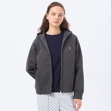 きれいめ素材のベーシックなジップアップパーカー。羽織りとしてシーズン長く着用でき、中肉のダンボール素材を使用しているのですっきりと着こなせます。