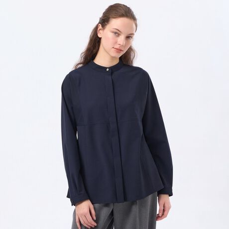 立体的なAラインシルエットがアイコニックなスタンドカラーブラウス。脇に縫い目がないことで裾のフレアが美しく広がるシルエットに仕立てております。