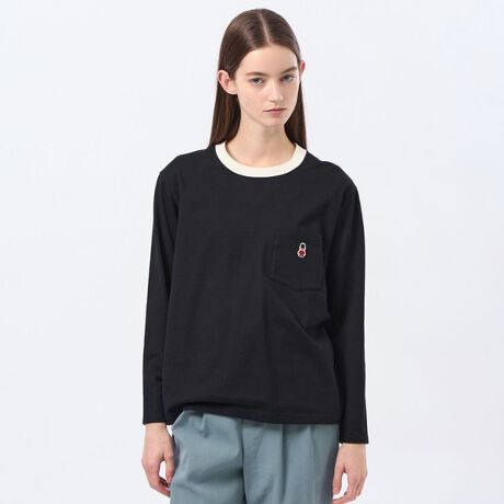 ベーシックな長袖のリンガーロンT。程よくゆとりがあるシルエットでインナーとしてでも一枚でも着回しのいいアイテムです。襟をバイカラーにしてアクセントを加えています。