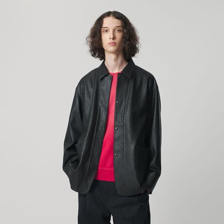 薄手ながらリアルレザーにも引けを取らない、上質な表情のレザーライク素材を使用したカバーオール。