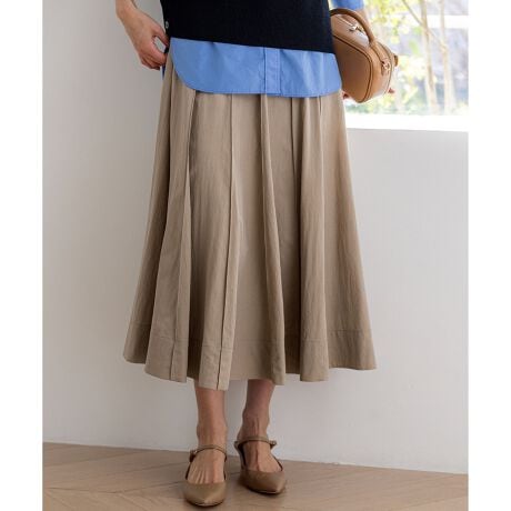 春らしい軽やかなボリューム感が魅力のフレアスカートです。腰回りはすっきりと見せつつ、裾に向かって優雅に広がるフレアラインが、女性らしい華やかさを添えます。ミモレ丈で長すぎないレングスはバランスがとりやすく、どんなトップスにも合わせやすい万能な一枚です。ブラウスと合わせてオフィススタイルに、Tシャツやニットと合わせてカジュアルダウンした休日スタイルにと、幅広いシーンで活躍します。足元はパンプスで上品に、スニーカーで抜け感を出すのもおすすめです。 カラーは、優しく上品な印象のベージュ(033)、爽やかで洗練されたサックス(072)、深みがあり落ち着いたブラウン(035)、着回し力抜群のシックなブラック(005)の4色展開です。