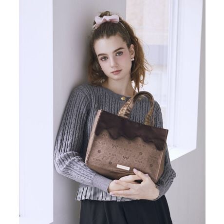 FLEURのロゴやリボン・ローズを取り入れた、オリジナルのチョコレート柄を使用したスクエアトートバッグ。