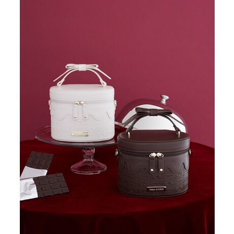 レザー調素材にFLEURのロゴやリボン・ローズを取り入れた、オリジナルのチョコレート柄を型押しで表現したキューブバッグ。