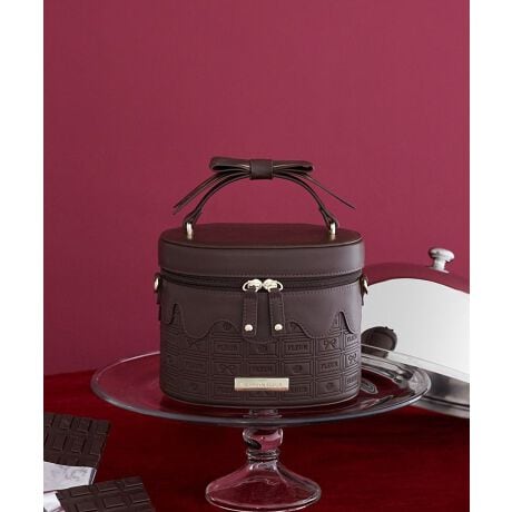 レザー調素材にFLEURのロゴやリボン・ローズを取り入れた、オリジナルのチョコレート柄を型押しで表現したキューブバッグ。