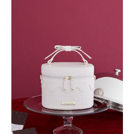 レザー調素材にFLEURのロゴやリボン・ローズを取り入れた、オリジナルのチョコレート柄を型押しで表現したキューブバッグ。