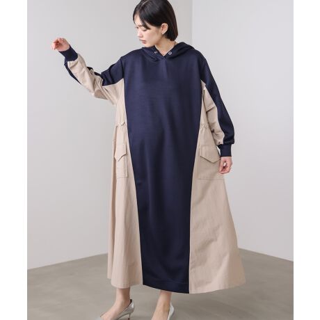 異素材の組み合わせが目を惹くデザインワンピースです。フロントと袖には柔らかなカットソー、サイドにはナイロンの布帛を切り替えることで、1枚で奥行きのあるスタイルが完成します。すっきり見えるストレートラインに、サイドのドロストでシルエットを調整でき、気分や体型に合わせてアレンジできるのも嬉しいポイント。ポケットもしっかり備えているので、デザインだけでなく実用性も叶えた一着です。