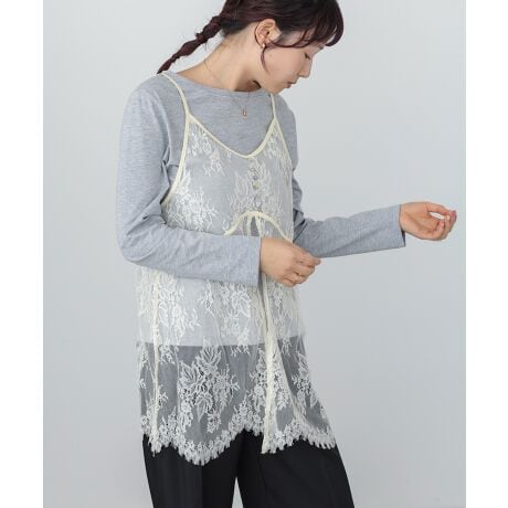 繊細なレースビスチェとベーシックなカットソーがセットになった、レイヤードアイテム。シンプルなトップスに重ねるだけで、ぐっとトレンド感のあるスタイルが完成します。華奢なラインで切り替えられたビスチェは、甘さを抑えた大人っぽい印象に。程よい透け感が抜けをつくり、シックで洗練された雰囲気を演出します。