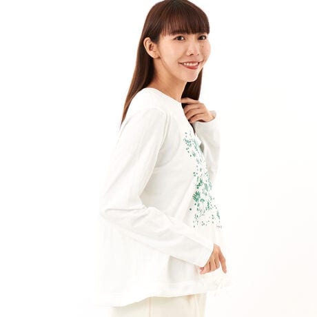 [型番:34950361]発泡プリントを施した30/-天竺のロンT。前身頃には、熱を加えて膨らみを出した発泡プリントを施し、花びらが舞い散るような柄を単色の刺繍のように仕上げました。裾には布帛をあしらい、 ドローストリング仕様でシルエットの調節も可能です。