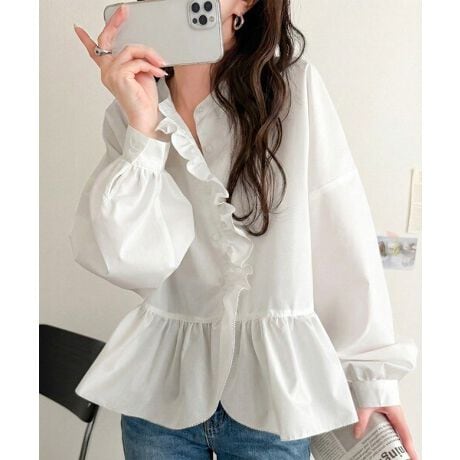 女性らしいデザインにこだわったフリルペプラムブラウス。