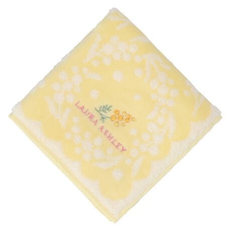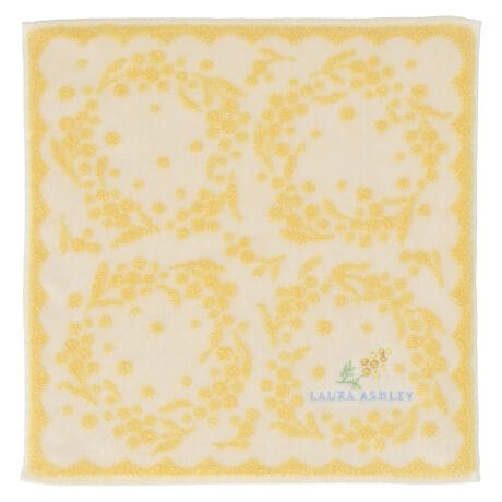 3月8日国際女性デーの象徴の花「ミモザ」の花束をデザインした刺繍がポイントのタオルハンカチ。リースのように描かれたリースにミモザの花が映える優しいカラーリングで贈り物に最適です。