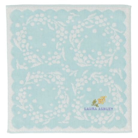 3月8日国際女性デーの象徴の花「ミモザ」の花束をデザインした刺繍がポイントのタオルハンカチ。リースのように描かれたリースにミモザの花が映える優しいカラーリングで贈り物に最適です。
