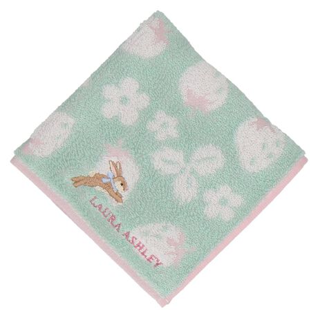 イースターにもピッタリなうさぎの刺繍がポイントのタオルハンカチ。イチゴ柄とうさぎのデザインがかわいい1枚。