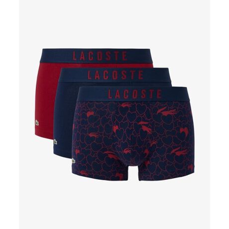[型番:5H4968-10]2枚の無地と、バレンタインデザインの総柄1枚を揃えた3枚セットのトランクショーツ・コットン×ポリウレタンのストレッチジャージ素材・バレンタインデザインのハート×ワニロゴ柄1枚と無地2枚の、3枚セット・コントラスト配色のブランドネームロゴ入りウエストバンド・ピッタリと全身にフィットするカッティング・右裾脇にワニロゴパッチを配置