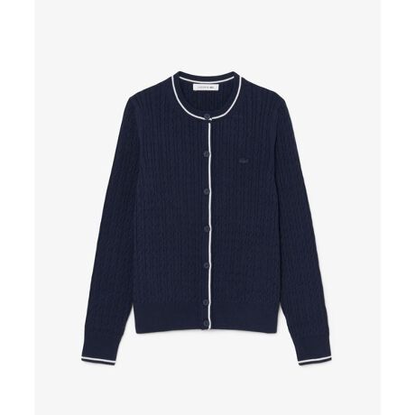 [型番:AF9872-99]さりげない配色ラインが映える、クラシックなケーブルニットカーディガン・オーガニックコットンとナイロンのブレンドニット素材・すっきりとしたレギュラーフィット×ストレートシルエット・シンプルながらも存在感が際立つクラシックなケーブル柄・ネックライン、前立て、袖口にコントラストストライプを配置・左胸に同色のワニロゴパッチを配置Regular Fit