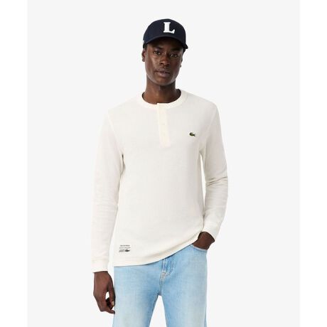 [型番:TH1300-10]上品な表情とやわらかな着心地を両立したワッフル素材のヘンリーネック長袖Tシャツ・コットン×ポリエステル×ポリウレタンのストレッチワッフルニット・ベーシックに着回せる、レギュラーフィット×ストレートカットのエッセンシャルなシルエット・高級感を宿すマザーオブパールボタン・左胸にワニロゴパッチ、裾にブランドネームロゴラベルを配置Regular Fit