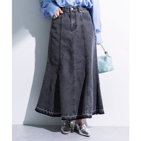 マーメイドシルエットがフェミニンに演出してくれるデニムスカート。ややストレッチの効いた柔らかい生地感にバッグウエストにゴムを配したリラクシーな穿き心地がポイントです。切り替えラインが縦見えを強調してスタイルアップ効果にも期待。合わせるアイテム次第でカジュアルにもきれいめにも着こなせるユースフルな一着です。透け感[なし]